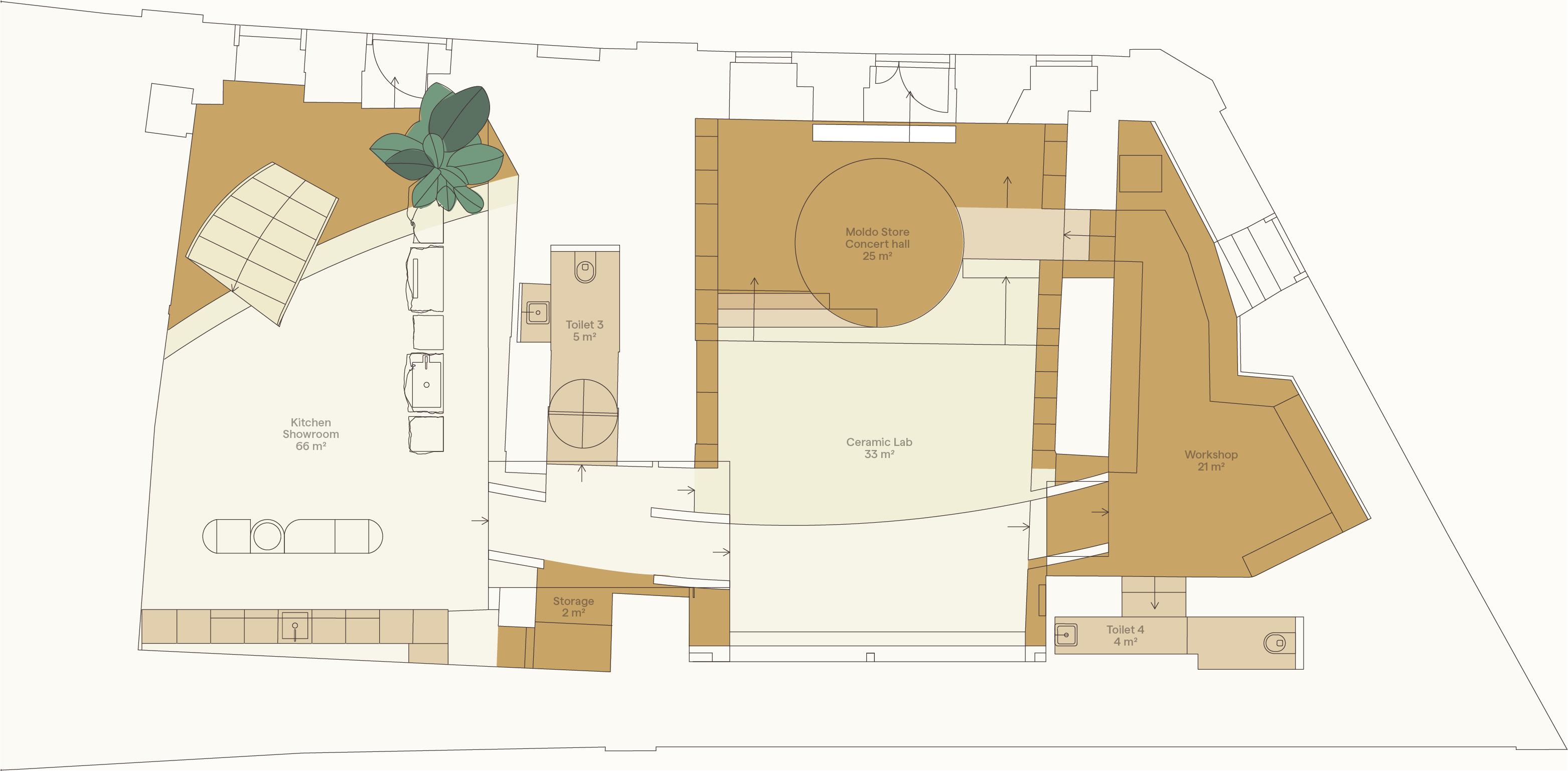 Spread over 300 m², it brings together an art gallery, reception, restrooms, product launches, a kitchen and bar showroom, concert hall, shop, yoga classes, a ceramicists’ residency, workshop, and studios. We needed to share it with the world, and as we explored it, we realised that its uses were already there.
